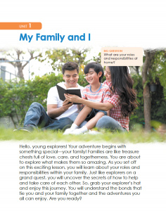 The Unit Opener shows the unit number with the unit title and a background picture. It also covers the unit introduction. In the sidebar is the list of lesson titles to be taken up in the unit or other add-ons that make the lessons more appealing and engaging.