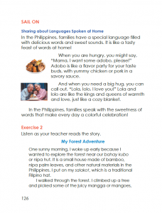 Sail On guides young learners to appreciate oral language by helping them notice language features, such as how changes in intonation can alter meaning, and how language reflects cultural practices and norms.